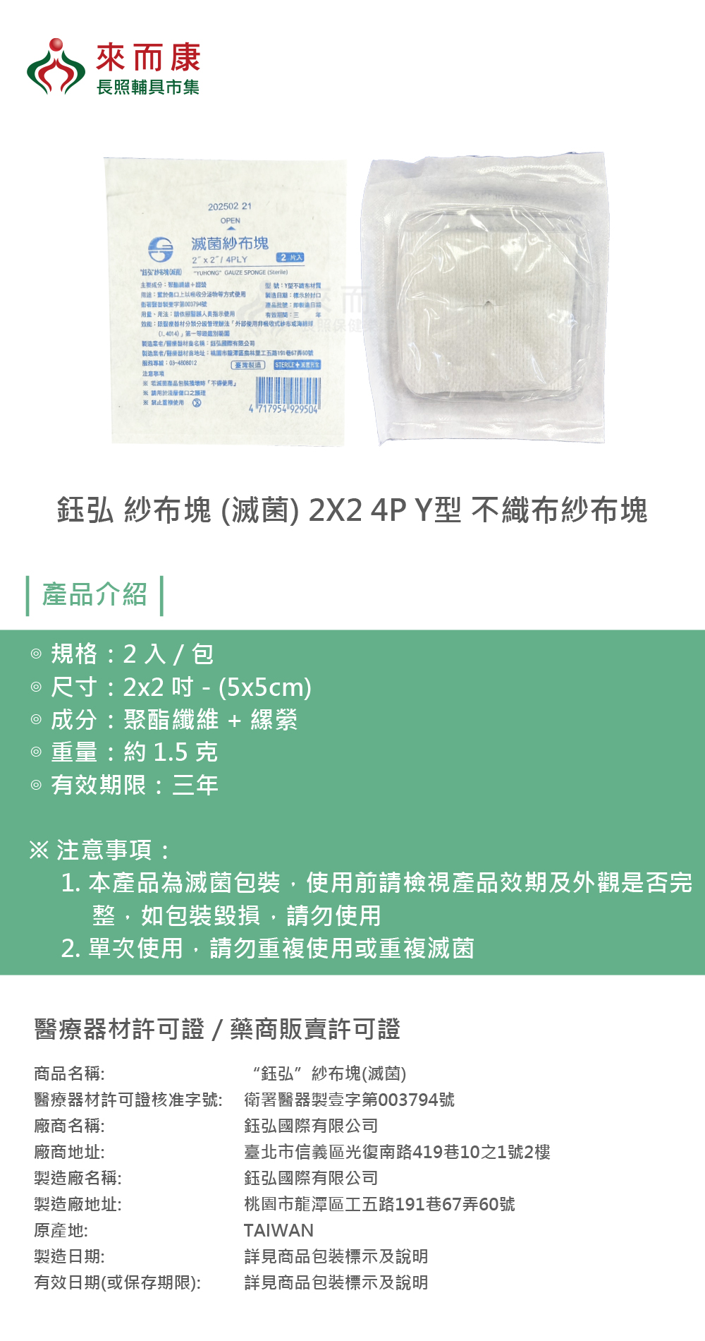 鈺弘 紗布塊 (滅菌) 2X2 4P Y型 不織布紗布塊 2入/包 3000包/箱 滅菌 紗布