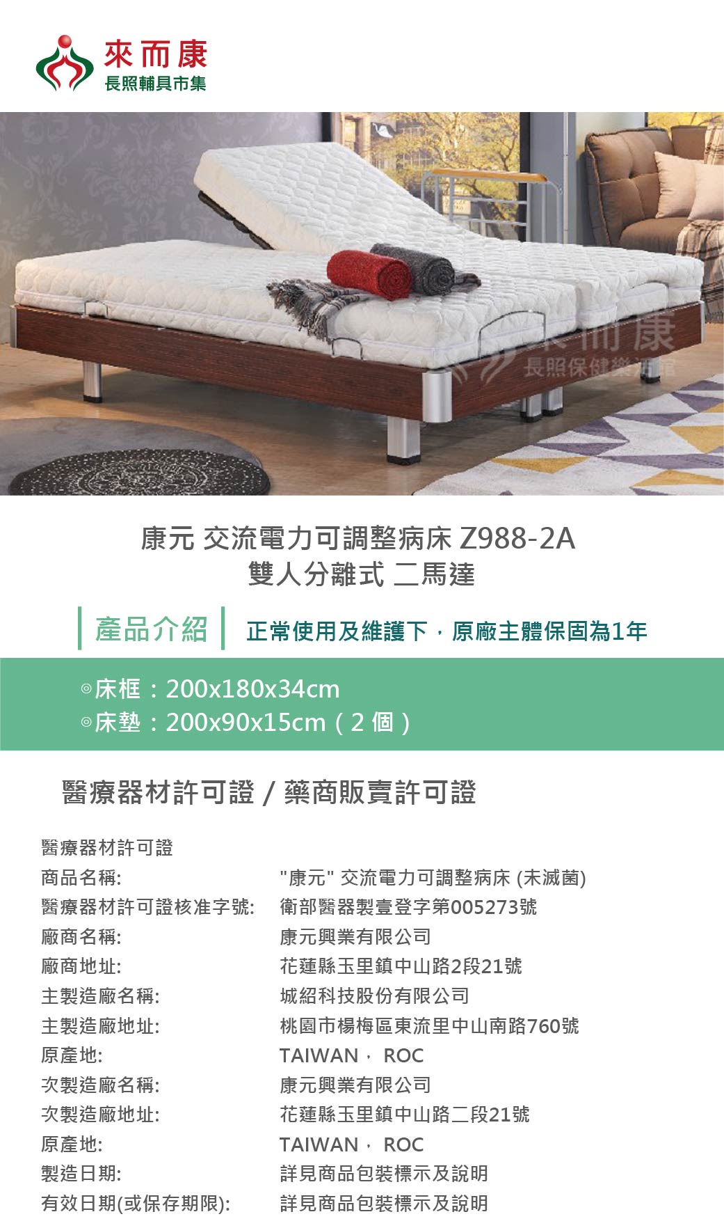 康元 交流電力可調整病床 Z988-2A 雙人分離式 二馬達 電動床補助 附加功能B款 雙人電動床