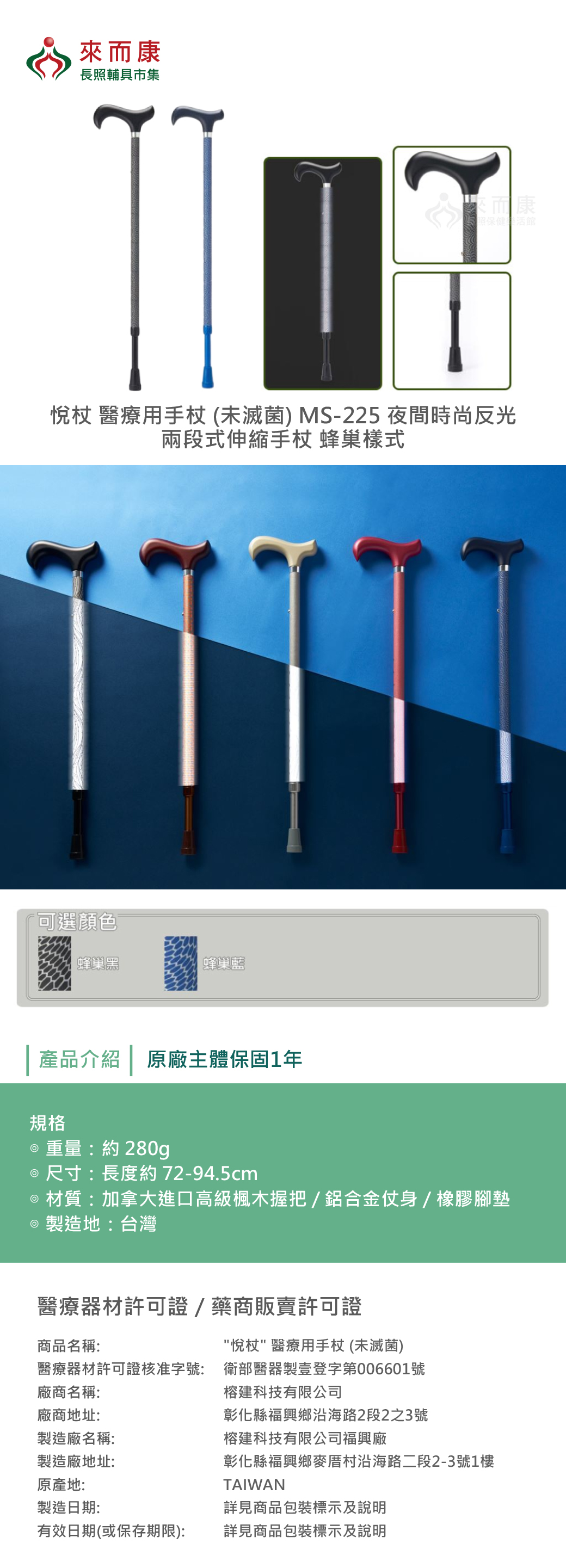 Merry Sticks 悅杖 醫療用手杖(未滅菌) MS-225 夜間 時尚 反光 兩段式 伸縮手杖 蜂巢樣式 MS225